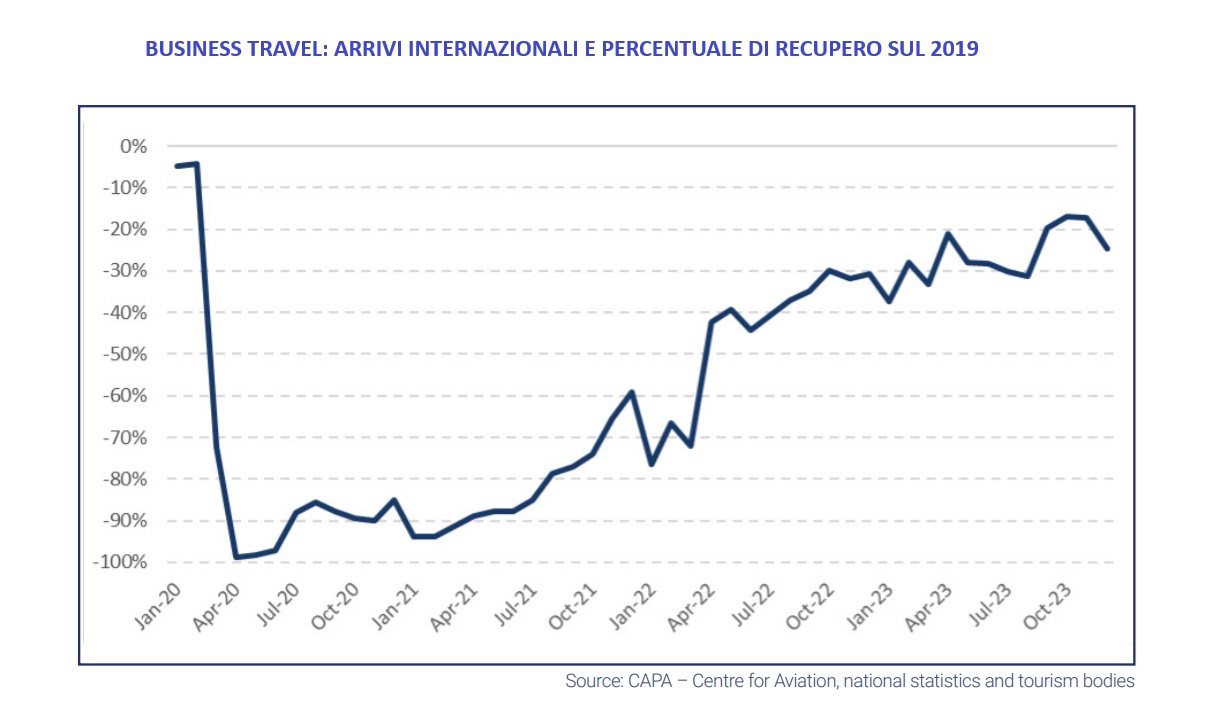Sulla base di un campione di 14 paesi (tra cui Stati Uniti, Regno Unito, Australia, Giappone, Spagna e Sud Africa), alla fine del 2023 gli arrivi businss erano pari al 75% dei livelli pre-pandemia.