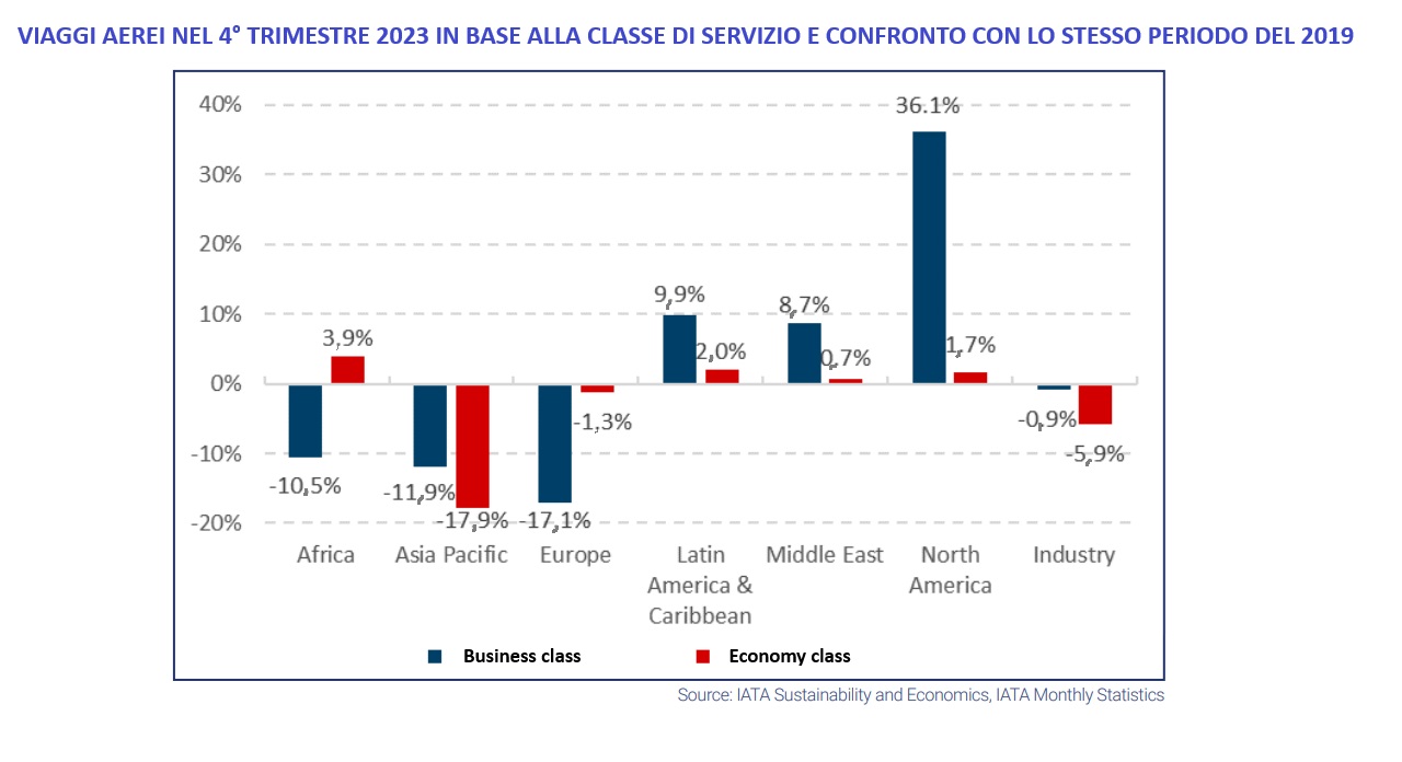 Secondo la International Air Transport Association (Iata), alla fine del 2023 il traffico che occupa posti business era al 99,1% dei livelli pre-pandemia. Questo mentre i viaggi in classe economica erano solo al 94,1% dei volumi del 2019.
