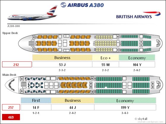 L’A380-800 di Ba presenta 14 posti in First nel ponte principale, a cui si accede da un’entrata dedicata insieme alla business, di cui presenta 44 posti sullo stesso ponte della prima più altri 53 posti sul ponte al primo piano. Dove ci sono anche 55 posti di World Traveller plus, l’economy plus di Ba, e 104 posti di Word Traveller, ovvero di economy. Altri 199 posti di economy sono sulla parte posteriore del main deck. In totale l’A380 di Ba offre 469 posti (14+97+55+303).